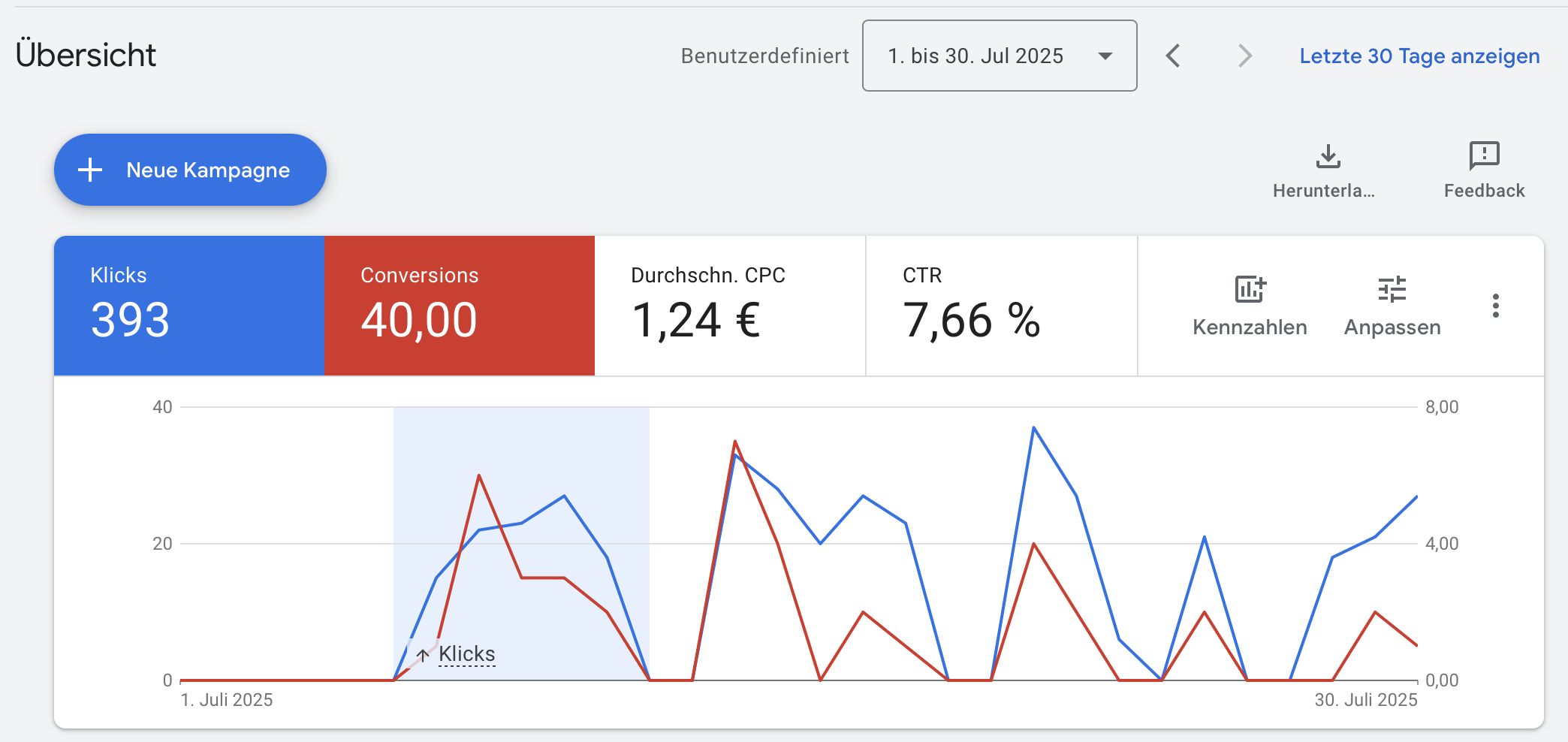 Wir haben die Website optimiert, einen Mini-Funnel gebaut, gezielte Google Ads geschaltet – und eine kleine E-mail-Kampagne gestartet.Das Ergebnis? +11.000 € zusätzlicher Umsatz im zweiten Monat im Vergleich zum Durchschnittsmonat.
